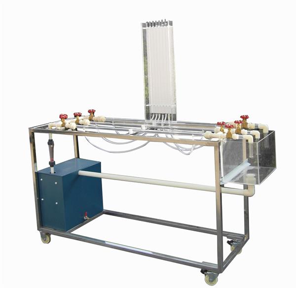 水泵、測速管、實驗管道、蓄水箱、計量槽、秒表、閥門、測壓管、自循環裝置、不銹鋼框架。